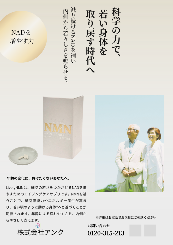 LivelyNMNは、年齢とともに減っていくNAD(細胞のエネルギー源)を補うために開発された次世代型のエイジングサポート成分です。