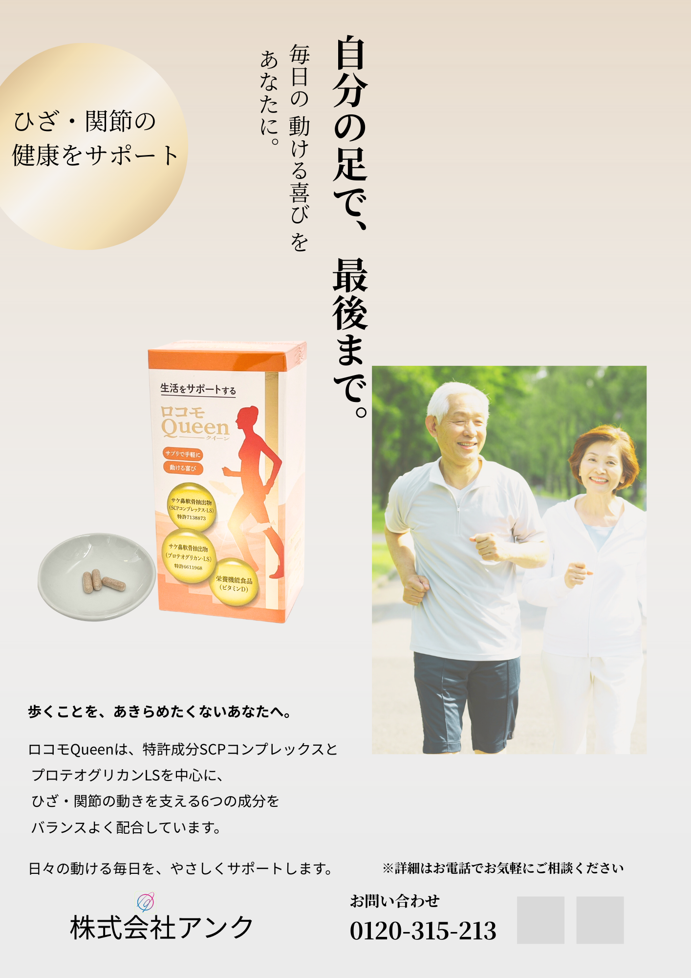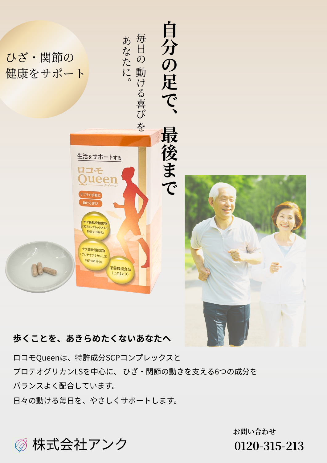 ロコモQueenは、特許成分であるSCPコンプレックスとプロテオグリカンLSを中心に、年齢とともに気になりやすいひざ・関節の動きをしっかり支えるための成分を、バランスよく組み合わせてつくられたサプリメントです。