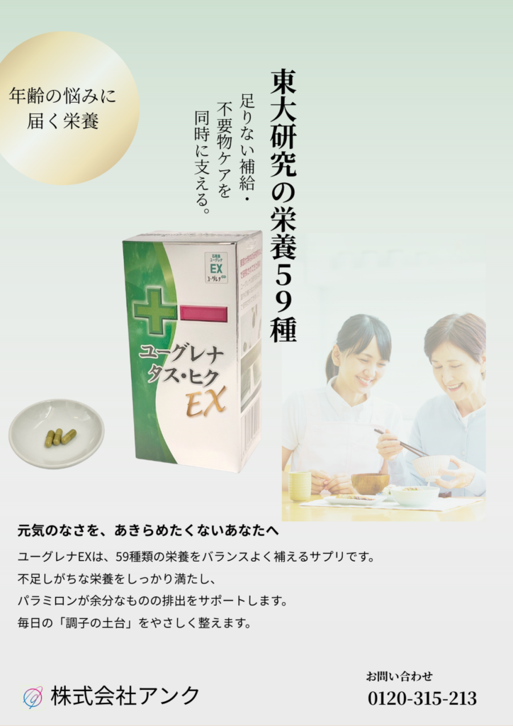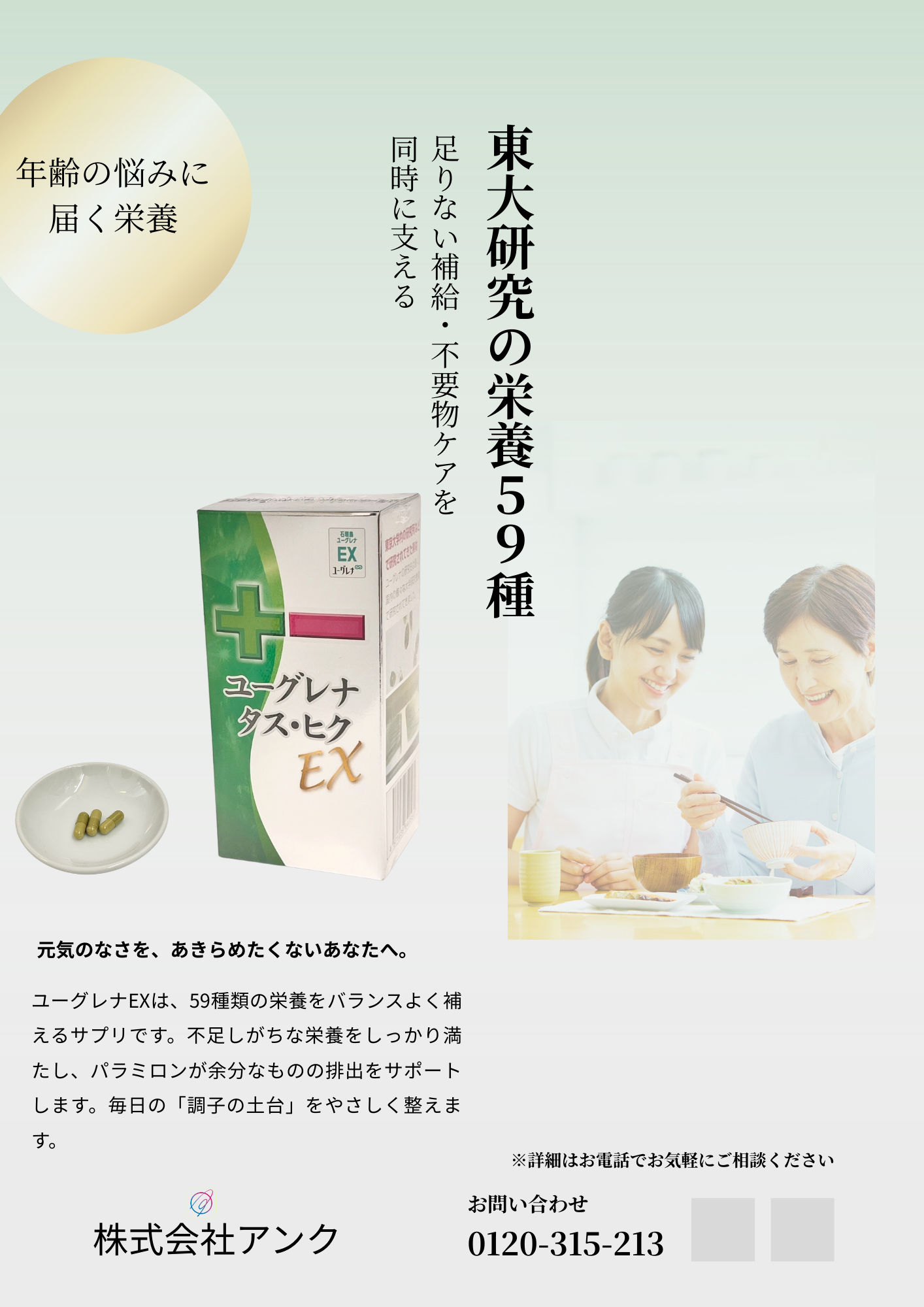 59種類の栄養素で不足分を補いながら、パラミロンが余分なものの排出をサポート。